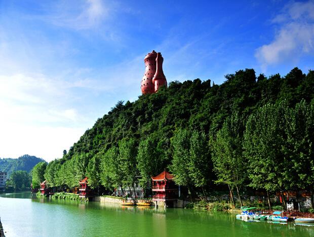 在茅台镇的一座小山上,有一个7层楼高、世界上最大的的茅台酒瓶,被誉为“天下第一瓶”。瓶内有螺旋楼梯可登高环眺茅台镇。