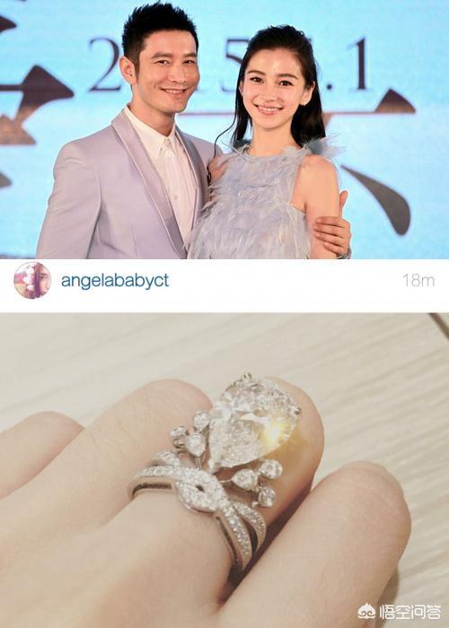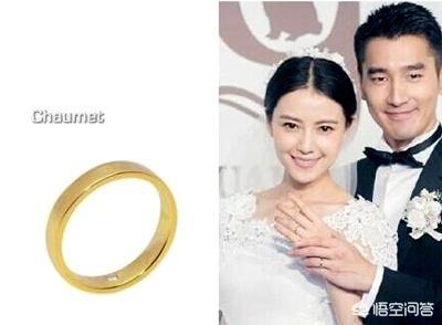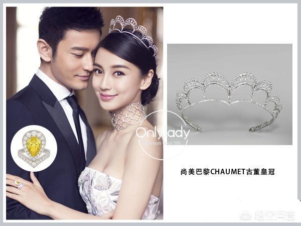 Angelababy戴的婚戒是来自尚美巴黎的加冕·爱系列钻戒,镶有1颗5~6克拉的梨形DIF级美钻,以及73颗明亮式切割钻石,寓意“为爱加冕”。这个款式也是让大家都非常喜欢的,以至于仿版很多,不仅有钻石的,还有各种宝石的。