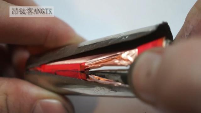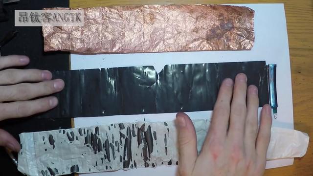 上面这个截图是,昂钛客头条号对特斯拉18650电池的拆解的电池真实材料!铜是电池的.负极集流体。黑色的是负极。白色的是隔膜。