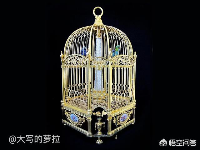 (雅克德罗制作于1770年的过梁鸣鸟提钟,采用镀金黄铜珐琅材质,鸟笼内有一对鸣鸟,中央是一个喷泉,可在指定时间或整点时鸣唱四个曲调)