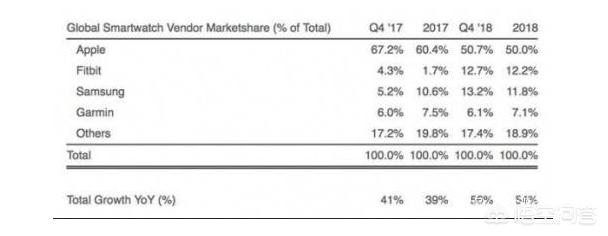 数据显示,苹果、三星、Fitbit和佳明是智能手表厂商的四大巨头,其总计出货量占全球智能手表总出货的80%。2018年四季度,苹果全球智能手表出货量为920万块,比2017年四季度的780万块增长了18%。