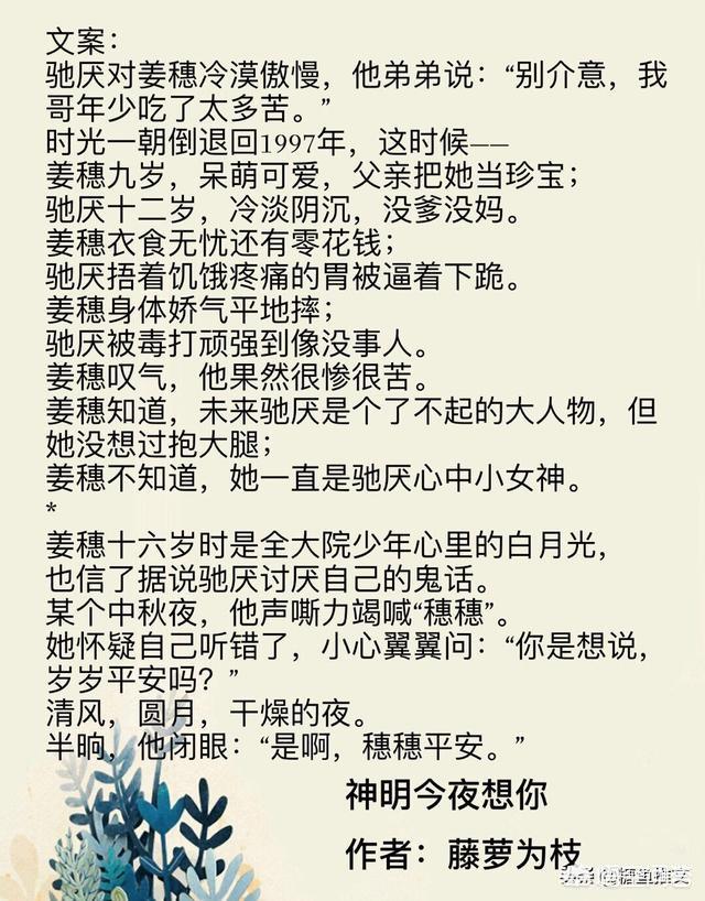 最近有很多小说都很好看啊,看的我都停不下来。 喜欢看小说的朋友一定要关注糖鱼,糖鱼每天为大家推荐各种小说哟。 最近觉得好看的小说推荐有: 校园甜文+男主偏执类1.藤萝为枝的《神明今夜想我》。 一本女主重生的校园甜文,我超级爱这个作者,喜欢他的《魔鬼的体温》《偏偏宠爱》原名《病态宠爱》《娇软美人》,男主都是霸道占有欲强偏执类型,女主都是小可爱,治愈男主的代表。神明这篇女主也是重生回小时候,男主同样小时候很惨,无父无母,还要捡垃圾养活弟弟,当然后期男主就很强大了翻盘了,女主上辈子害怕男主,重生后才发现男主很惨,害怕的时候又忍不住帮助他,治愈他,而对男主来说,他喜欢了女主两辈子。反正很好看啦。 2.春风榴火新文《在偏执的他心里撒个野》。 超级好看,是《在暴戾的他怀里撒个娇》同系列文第二本,也是女主重生文,女主重生治愈男主,看过暴戾这本的人一定不能错过了,类型都一样,男主女主我都爱,太好看了。 3.《穿成菟丝花女主的姐姐》。 很好看,前面以为就是单纯的校园文,女主穿越遇见男主学霸。改变自己的命运,最爱这段女主不想撩男主,但是男主一直觉得她很可爱很爱他的情节,笑死了。到后面有一点悬疑,男女主有三世人生,还有法术的感觉,女主一直莫名其妙死去,每一世两人都互相爱恋,后面经过两人努力终于打破了命运的枷锁。 4.《好好学习,天天恋爱》。 女主重生学霸文,励志文。前世女主很普通,男主竹马学霸,牛人,即将迎娶白富美走上人生巅峰,两人渐行渐远过上不同的人生。很让人遗憾。重生后女主努力学习,成为学霸的同时搞定了男神竹马。这本很励志,告诉我们只要努力就会成功,但是糖鱼只能过女主上辈子那种了。。。伤心。 穿书文1.陛下不上朝的《我帮首富花钱挡灾》 这本就是单纯的甜文爽文,男主超级富豪,女主穿书后被原书男主抛弃,转身嫁给首富之子,然后不断替他花钱消灾,很搞笑。 2.凤阿凤的《黑化男配是我同桌》 一篇穿书女配,原著男主黑化大佬,毁灭世界,女主穿后为了世界和活命不断拯救男主,让男主感受到了仅有的温暖并爱上了他。男主家庭不好,父亲很坏,经常敲诈他,男主化学很好,后期成为了科学家。这篇一直是女主为男主付出,女主真的很善良很美好,为了男主付出很多,还为了男主出国等,很爱这个女主。 3.美人无霜《大佬成了我三岁儿子》很好看的一篇晋江榜单文。带一点奇幻色彩,男主会变成三岁小朋友,被穿过去的女主捡到,小身体大灵魂的反差感十足,这一段特别逗。男主先狗后忠犬,追妻火葬场系列,不虐,文文甜到牙痛。 4.绵夏《穿成女配带球跑》这本也很热门,女主穿到一本古早霸总文里,自认为男主不爱原书中女配,自觉远离男主,才发现情节与原书不对,其实男主高冷偏执,深情不渣,从头到尾只爱女主一个人,也属于娱乐圈文。 都市甜文1.顾西爵新文《我念你如初》是一本双向暗恋+久别重逢的文,特别温暖特别治愈。半校园半都市,涉及戏曲题材。女主是可爱听话软糯全才话剧小导演,男主是高贵冷艳昆曲界当红小生,两人在校园时期相互暗恋,后来分开相遇,女主原本是很淡定的人但是与男主重逢后,立马状态不佳,没事朝别人笑,特别甜。男主日子过得像退休老干部,吃饭姿势很糙,望着小许导的眼神,是一脸想结婚生子的表情。谈恋爱的时候腻腻歪歪,总之是一篇超甜文。 2.栖见新文《玫瑰挞》超级好看,因为《白日梦我》而喜欢上这个作者,她的文超火超甜。这篇《玫瑰挞》女主是拥有网红身份的上班族,男主军校入伍,男女主从小一个院子长大,男主一直以为女主喜欢别人,但是其实他们俩相互暗恋,中间分开十年后再次相遇,这时男主因为出了事很丧,遇见女主治愈了他。很爱这本。 3.玖月晞新文《南江十七夏》文笔和故事一日既往的好,在文中对自己的童年青春也很有一种共鸣,写的是学生时代的故事,也有关于五个小伙伴从小到大的友谊,就像是看自己的过去一样,很特别的一篇文。 4.鹿灵《初吻日记》是一篇超甜的娱乐圈恋爱甜文,开篇是男女主上综艺谈恋爱。但是其实女主高中就暗恋男主,私下各种吹男主彩虹屁,见到男主又很怂。中间还有女主被公司坑,男主实力护妻的情节,整体是一篇很甜很甜的恋爱文。收藏很高很好看。 5.梦筱二《盛夏之恋》强推。梗超多,有破镜重圆+女追男+追妻火葬场情节。女主白富美,从小就喜欢男主,先追求男主先表白。男主是《就这样恋着你》那本书的男二,霸总一枚,从前有很喜欢的人,认识女主后为了不让女主知道从前那段一直撒谎,期间还伤害过女主,后来女主知道真相,就开始虐男主,男主开始了追妻之路,最后大圆满结局,非常好看。 古言重生文1.《蜜宠娇娘》是一篇重生种田文,宅斗类型的甜文。 2.《相公,你也复生了?》是一篇重生弥补类,追妻火葬场古言甜文。 3.《三弃公子》是一篇重生虐文,虐恋情深,男主超级病娇偏执。 4.假面的盛宴这本《家养小首辅》特别好看,特别热门,也是一篇老文了,再次推荐给大家,因为这本实体书预售开始啦,喜欢的朋友可以再次看一遍。 5.绿药《给前任他叔冲喜》超级热门,晋江收藏16万多,古言婚后文,我特别喜欢男主为女主做好一切的剧情,文笔和剧情都很好,大爱。 6.醉折枝《给您跪下》是一篇甜的搞笑的古言重生,架空历史,略有唐影。剧情有起有伏,也有伏笔,1v1撒娇打滚