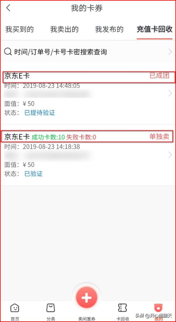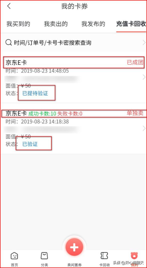 5、点击回收京东卡的,里面可以查看每一张京东卡有没有进行验证和验证是否成功。