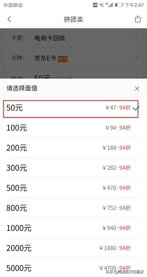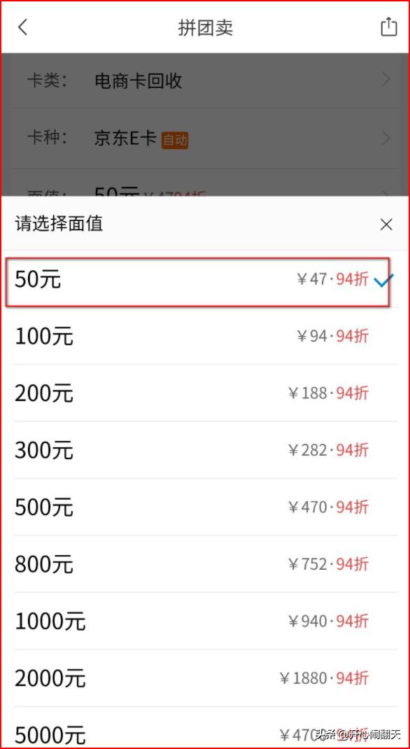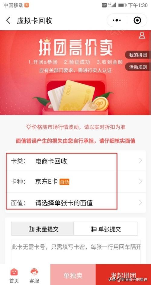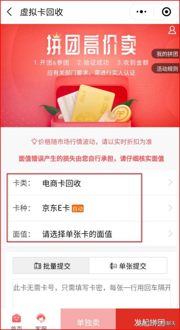 3、然后在里面可以进行拼团回收京东卡或者是单独卖京东卡, 回收京东卡都是以94着进行回收的,如果你是拼团的话,是945折进行回收。