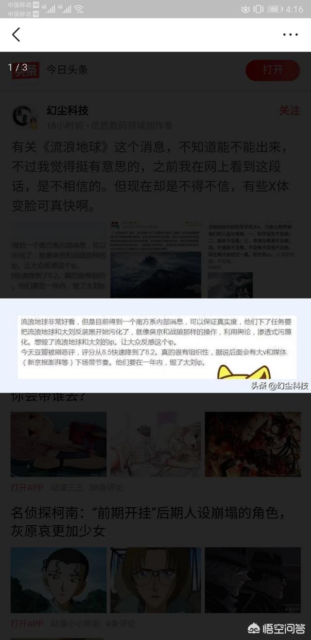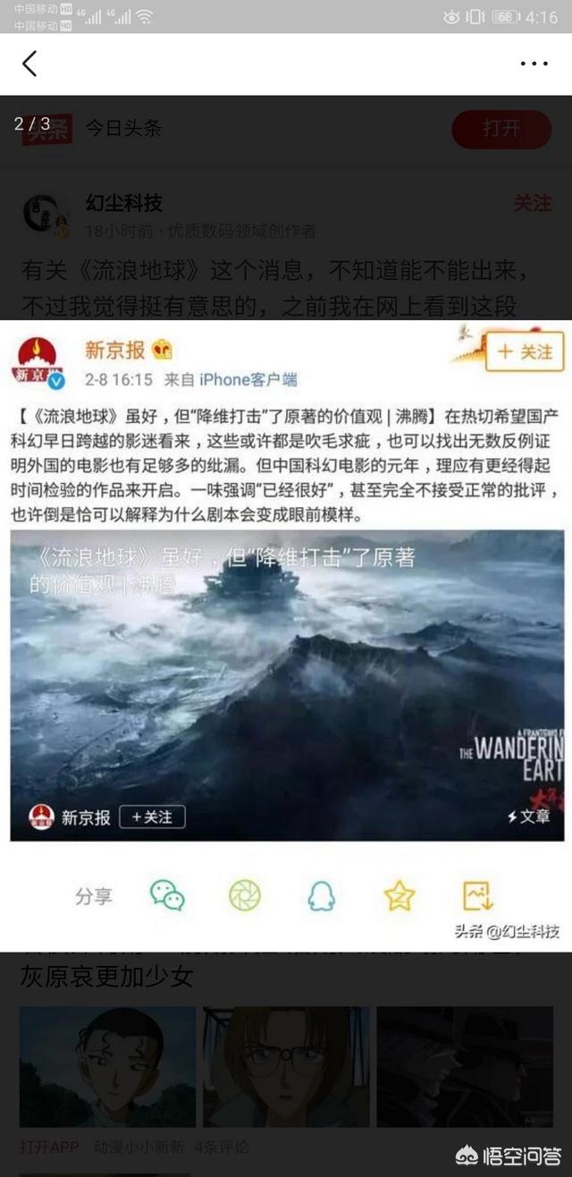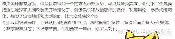 流浪地球的大卖,某种程度上可能触动了某些人的利益和蛋糕。所以在流浪地球口碑票房双丰收的情况下,那些人就坐不住了,就采取了一些手段如同利用某些有影响力的媒体写流浪地球的问题,利用网络水军到处宣扬流浪地球大刘吴京等人的问题,刷低豆瓣评分等等。这些人就包括新京报还有一些其他的媒体。 流浪地球的成功不仅是郭帆导演团队的成功,也是中国科幻电影的成功,中国科幻电影刚刚起步,就有人想让他胎死腹中,这些人都是为了利益什么都不管的人,他们眼中只有钱,利用小鲜肉流量,赚一笔是一笔,非常的可耻。但是呢,他们的计划并不会搞臭流浪地球,反而会暴露出他们丑恶的嘴脸。因为,大众的眼睛是雪亮的,我们相信流浪地球,喜欢他,拥护他。祝愿流浪地球大卖,祝福中国电影!!! |