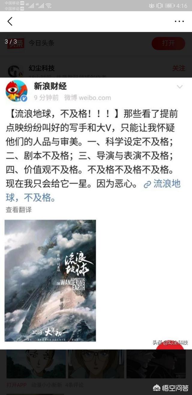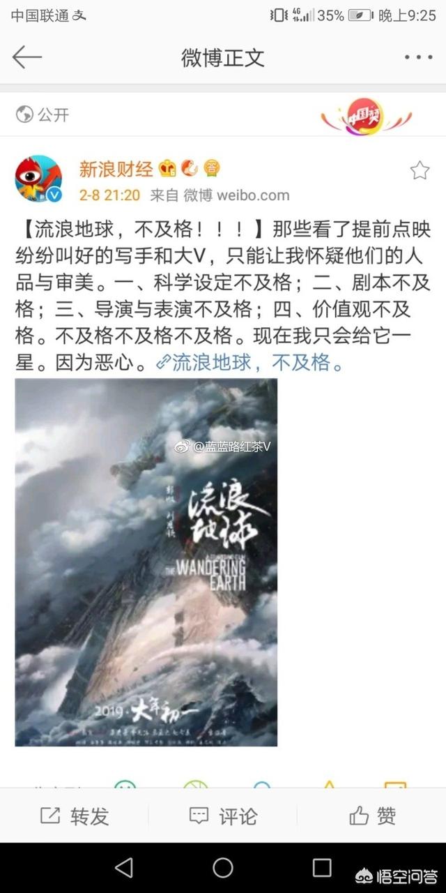 刚刚看了新浪财经官网对电影《流浪地球》的评论,我认为对这种评论大可不必去理睬。因为这个评论,没有论点、论据和论证过程,纯属污蔑、谩骂的本事。鲁迅先去曾说过,恐吓和谩骂绝不是战斗。对于这样一部以中国人所熟悉的情感结构与审美方式去讲述一个关于科技、时空、文明的人类命运共同体故事的影片,做为中华儿女应该为其感到骄傲和自豪,而不是怀着见不得别人比自己好的灰暗心里,对影片指手划脚、毫无理由的进行谩骂攻击。