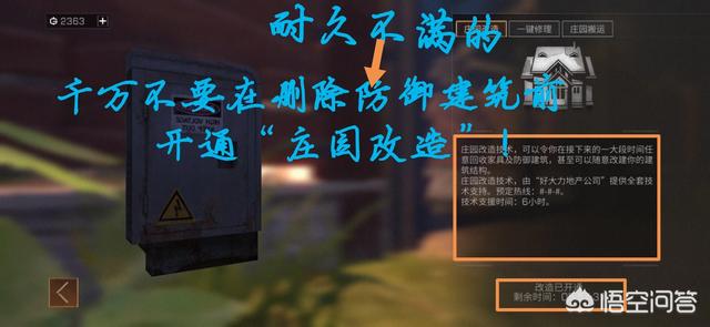 大家好,这里是油炸鬼,很高兴来为大家解答! 相信大家应该都有这个经历:你辛辛苦苦造了一个好看的蓝图,然后收集了大半天的建筑材料,并且你要做某事的时候开通了“庄园改造”,当你要把蓝图变为现实时,却提示你某些防御建筑耐久不满!但是你也回收不了,该怎么办呢~~