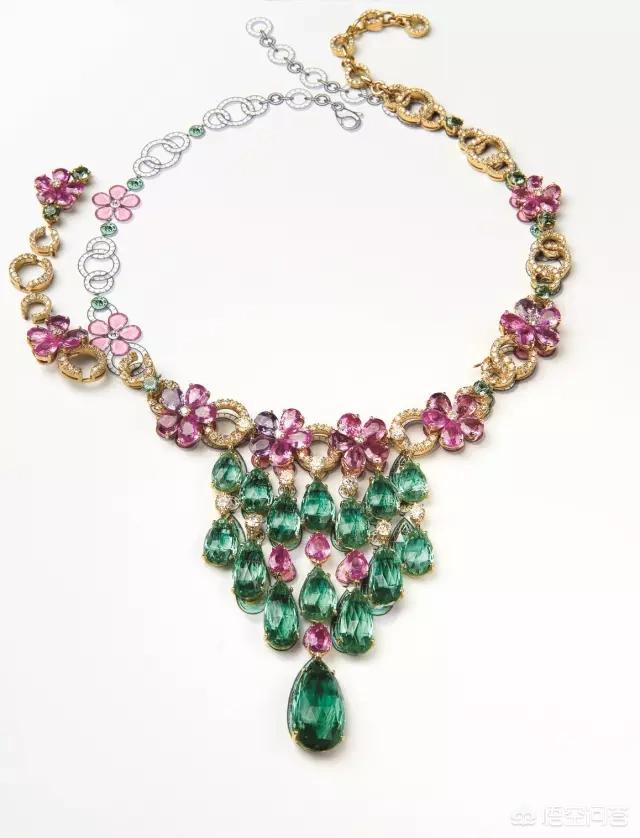 图解:来自BVLGARI顶级珠宝系列的项链,镶嵌彩色蓝宝石、薄荷色碧玺与钻石。