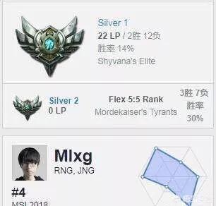 《英雄联盟》S8已经过去了,虽然我们LPL赛区获得了这次的总冠军,但是玩家们却怎么也高兴不起来,因为这次被我们给予厚望的RNG战队没有打出来自己想要的成绩,在八强赛中败给了G2战队,让很多粉丝非常失望,而打野Mlxg也是仅仅只上场三局比赛就结束了自己的S8的旅程,近日有网友找出来了Mlxg韩服的游戏账号,段位仅仅为白银!