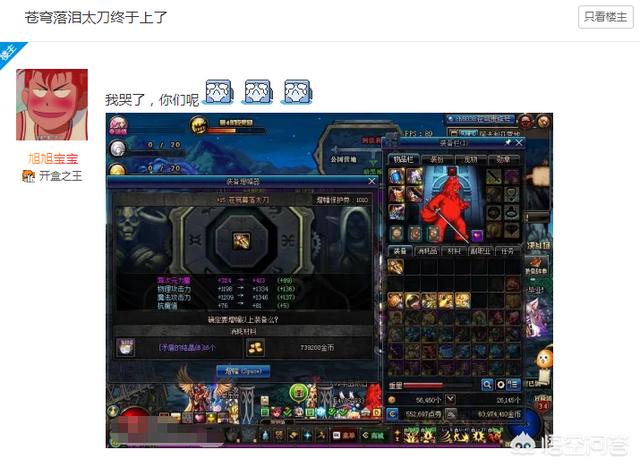 但是要说到最吃钱的,还是要属旭旭宝宝的苍穹落泪太刀了,花了将近100WRMB历经80个小时的时间才将这把武器增幅到15,可以说在这之前增幅其他武器都没有它这次增幅苍穹武器那么黑,不知道大家怎么觉得,反正我是觉得苍穹武器的强化概率确实被策划暗调了,难怪苍穹这么好出,摆明的就是要你打造坑钱的。