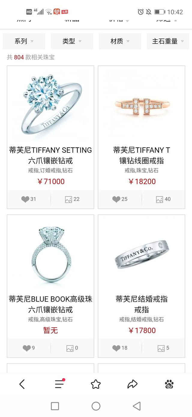 一 拿国内的知名周某福、周某生等珠宝品牌来比较,蒂芙尼的戒指就要比周某福、周某生的戒指贵很多,最基本的款式价格也需要在两三万,好一点的十几万或者四五十万都很正常。