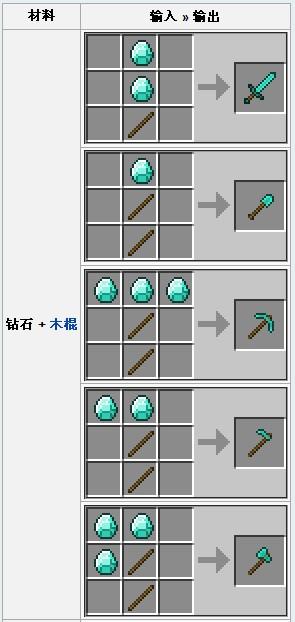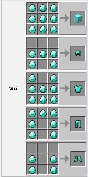 钻石可以使用工作台来合成钻石工具、武器或护甲, 它们在游戏中都是耐久度最高的 同时是效能最好的。钻石块要用9个钻石在工具台的3x3中放满。