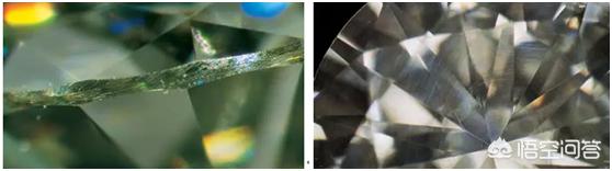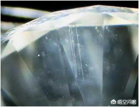 成碳硅石内部特征与钻石往往不同,内部常见近于平行的白色的针状包裹体,有时还会出现白色针点状的包裹体,形成云状包裹体。