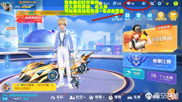 现在进入QQ飞车的游戏界面,你可以看见右上角显示钻石点击+号,进入充值界面