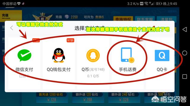 这次你能看到支付方式了吧,QQ飞车并没有和云闪付有关联,但是你可以看见我们选择这个手机话费支付的按钮,我们就要用这个手机话费来支付。