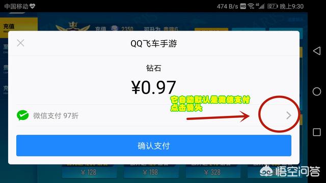 QQ飞车手游是自动默认的微信支付,也是有优惠的,我们点击向右的箭头进入选项。