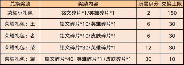 一个“王”宝箱:需要6积分,兑换上限为30个,可获得10铭文碎片或者1英雄碎片一个“者”宝箱:需要12积分,兑换上限为30个,可获得10铭文碎片或者1皮肤碎片一个“荣”宝箱:需要12积分,兑换上限为30个,可获得30英雄碎片或者1英雄碎片一个“耀”宝箱:需要30积分,兑换上限为10个,可获得40铭文碎片+1英雄碎片+1皮肤碎片一个“小礼包”:需要2积分,兑换上限150个,可获得1铭文碎片或者1英雄碎片换哪些宝箱?如果说真的算一下,想要拿到这些礼包,那么需要很多的钻石的,所以说无论是老玩家还是新玩家,全部换取并不是明智之举,那么到底换取哪些更合适呢?