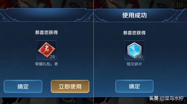 小编的建议是先换取10个“耀”礼包,为什么呢?我们看礼包的里的东西不难发现,除了“耀”礼包中的奖励是确定的,其他的都是二选一的概率,而且都是铭文碎片的概率大一些,因此上对于钻石不是非常充裕的玩家来说并不划算。而10个“耀”礼包,需要花费3000钻石,打开后必会获得10英雄碎片、10皮肤碎片和400铭文碎片,这个就比较有价值了。