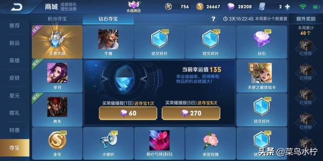 第三是抽奖池。在钻石夺宝中抽奖也可以消耗不少钻石,期间不仅可以获取金币、铭文、体验卡等奖励,还可以获得王者水晶来换取水晶商店的英雄或者皮肤。