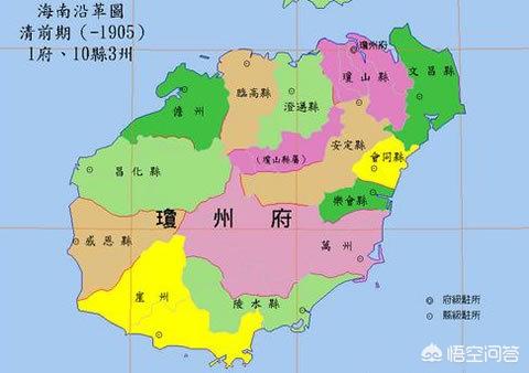 宋元 宋 两广与海南岛 宋朝,海南岛与今广西壮族自治区的大部分一起属于广南西路。唐宋八大家之一的苏轼曾被贬官至此。 元朝,岭南地区和海南岛没有单独设置一级行政区划,而是将原宋朝广南东路辖区归江西行省管辖;原广南西路划归湖广行省管辖,今海南省和广东省雷州半岛,都归湖广行省管辖。 宋以来,中沙群岛被称为千里长沙。1279年,著名天文学家郭守敬进行“四海测验”时在南海的测量点就是今海南省南海中的黄岩岛。 《元史》地理志和《元代疆域图叙》记载元代疆域包括了南沙群岛。《元史》还记载了元朝海军巡辖了南沙群岛。 元 湖广行省统治下的海南岛 明清 明朝初期,两广与江西、湖南分开。由于广西壮、黎、瑶三个民族反明起义猛烈,明朝皇帝朱元璋采用分而治之的办法,把黎族聚居的海南及广西门户钦、廉州划归广东。 从明朝开始,琼州府隶属于广东省,治所在琼山县(治今海口市琼山区府城镇),管辖全岛。西沙、南沙群岛正式划归琼州府管辖。 清朝基本沿袭明制,至清末,海南岛上有1府2州11县。府即琼州府,领儋州和琼山、澄迈、定安、文昌、会同(今琼海)、乐会(今琼海)、临高7县。崖州于光绪三十一年(1905年)升为直隶州,领感恩(今东方)、昌化(今昌江)、陵水、万县(今万宁)4县。 明代《海南卫指挥佥事柴公墓志铬》中的记载表明南沙群岛属于明代版图,明代海南卫巡辖了西沙、中沙和南沙群岛。在清代, 中国政府将南沙群岛标绘在权威性地图上,对南沙群岛行使行政管辖。1724年的《清直省分图》之《天下总舆图》、1755年《皇清各直省分图》之《天下总 舆图》、1767年《大清万年一统天下全图》、1810年《大清万年一统地量全图》和1817年《大清一统天下全图》等许多地图均将南沙群岛列入中国版图。 民国 1916年10月,龙济光被滇桂护国军和广东民军击败,退守海南岛,管治直至1918年。 桂系军阀沈鸿英(1919-1920年)和滇系部将李根源(1920年)先后统治海南岛。 1921年1月,邓本殷率部队打败旧桂系的琼崖驻军团长何福昌,进占海南岛,直至1926年1月被国民革命军张发奎部和陈济棠部联合打败,撤出海南岛,结束对海南岛近5年的管治。 海南在明清时期一直归广东省管辖,至国民党执政的中华民国南京国民政府时期,方获升格为省之机会。先是胡汉民、孙科提议设立琼崖特别区,并于民国20年(1931年)12月7日,国民政府国务会议决议:划广东省环崖全属为特别行政区,直隶国民政府,设行政长官,并任命伍朝枢为行政长官[1]。伍朝枢于民国21年(1932年)3月1日就任琼崖特别区行政长官;4月16日,在海口设立琼崖特别区长官公署临时办事处,以琼崖原有13县及西沙群岛为管辖范围[2],5月27日,西南政务委员会修正公布的《修正琼崖特别区政府组织条例》,惟后因陈济棠暗中阻挠,改建事宜未能实施。 抗战胜利后,民国36年(1947年)8月,行政院院务会议通过以琼崖改为海南特别行政区
