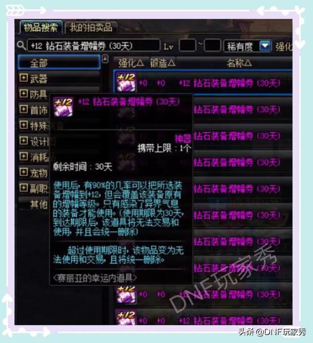 但是,12钻石增幅券不是百分之百的增幅12成功,而是有几率的,90%!但是,对于DNF的概率问题,历来只有两个极端,要么成功100%,要么失败0%,90%的高成功率也逃不过这个定律。