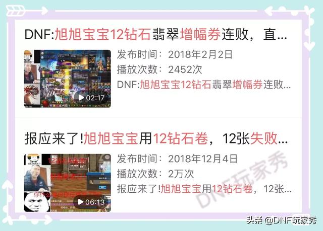 秀儿还记得一个报道,一位玩家网吧玩DNF,12钻石增幅券两连败猝死,让人痛惜不已;还有就是增幅王旭旭宝宝,也创下了12张钻石,翡翠12增幅券12连败的最高纪录,无人打破,坐实了“国服增幅万个”的美名!