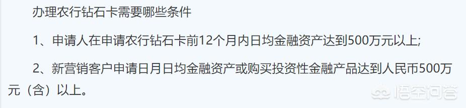 农行钻石卡是农行最高等级的信用卡,是系统根据你的资金量来自动评定的,不是说想开就能开的,即使找行长也不能随意给你开钻石卡。需要满足着以下条件才能申请: