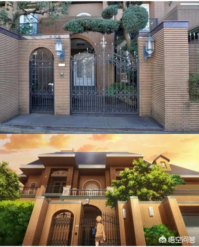 似乎除了种植的树木品种不大一样,以及吊挂在墙壁上的路灯换了一个款式外,二次元动画和三次元实景的大门形态(包括入口处的凹陷构造,以及墙壁的配色,还有房檐上的颜色搭配等等)都基本是划一性匹配的。