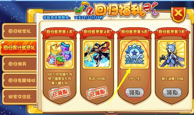另外加就是回归玩家是有很丰厚的奖励的,有些东西不要忘记领取,第一天就可以获得100级的佣兵,第三天就可以得500万+300万经验大礼包,可以让你喜欢的宠物瞬间到100级,在也不用辛辛苦苦练级了,以前给宠物练级是真的累,回合制游戏,动作又慢,好墨迹了。另外就是在线奖励不要忘记,在两个小时就足够了,能够获得各种经验果实和药水,说实话那些防御果实,魔攻果实都没有见过......第七天的话还会给其实迪莫,一只很强的宠物。