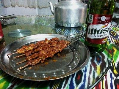 我们提前定了个大包间,晚上大概一共15个人,把那个大包间坐得结结实实。到了新疆餐厅,肯定要吃正宗的新疆菜和正宗的新疆啤酒。我为了烘托气氛,直接让服务员给我们拿了2打24瓶乌苏啤酒。不知道是不是新疆人酒量都很好,服务员给我们上的啤酒杯都是大口径水杯,这要是每碰一次酒杯都要干了,真有点渗人啊。