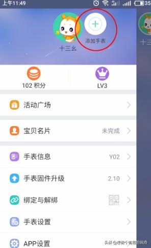 1、打开小天才电话手表的家长app,左侧点开,见手表信息页,点击添加手表(如下图)