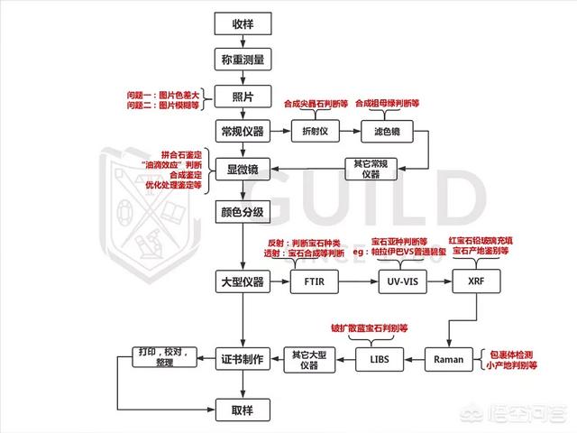 GUILD宝石检测及证书开具流程揭开GUILD宝石检测的神秘面纱,我们更加了解宝石检测每一个步骤的重要性与严谨性。每一颗石头都需要经过层层关卡,才能得到最终的检测结论。无论是常规仪器、镜下观察还是大型仪器,每一个步骤的疏忽与缺失,都有可能导致对一颗宝石是否天然、是否经过优化处理的误判。