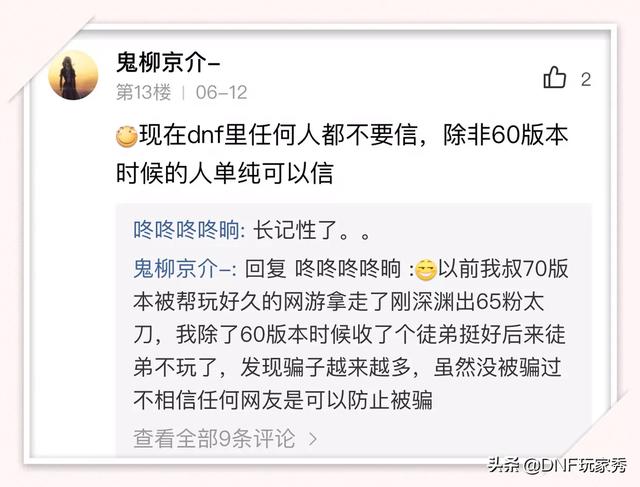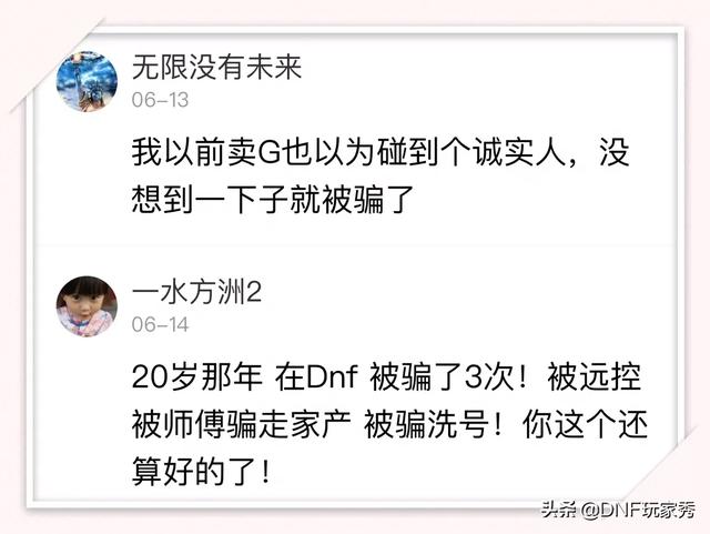 确实,DNF现在是骗子横行,金币交易骗局,代刷深渊骗局等等,玩家们也纷纷诉苦,分享自己被骗经历: