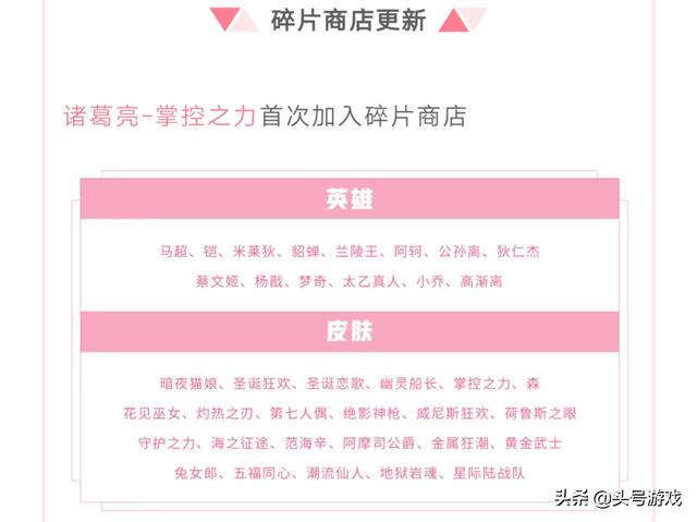 皮肤碎片商城更新就在今天皮肤碎片商城也迎来了一次更新,此次更新上线了4款史诗皮肤,阿轲的暗夜猫娘,吕布的圣诞狂欢,貂蝉的圣诞恋歌,曹操的幽灵船长。其中最值得兑换的全款史诗皮肤是吕布和貂蝉的圣诞cp皮肤,除此之外团战系列皮肤诸葛亮的掌控之力首次加入,这款皮肤的性价比还是比较高的。他的上线也意味着李白和孙尚香的团战皮肤不久后也会上线!