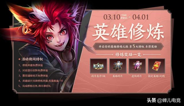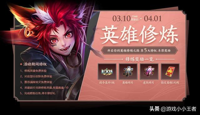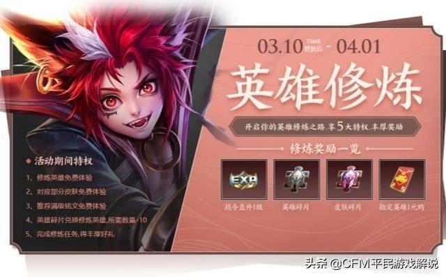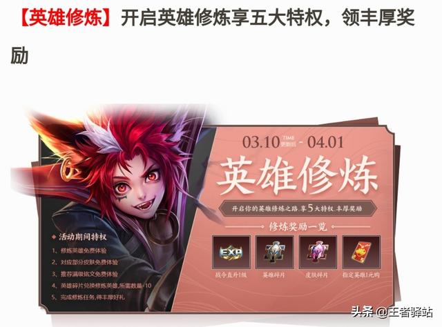 英雄修炼活动来袭英雄修炼这个活动在去年上线过一次,活动开启,一直延续到4月1号,开启这个活动之后玩家们可以享有5大特权,修炼英雄免费体验,对应部分皮肤免费体验,推荐铭文为免费体验,英雄碎片兑换修炼英雄所需数量减10,完成修炼还可以得到丰富的奖励。奖励有:战令等级直升一级,皮肤碎片,英雄碎片指定英雄一元购。