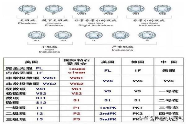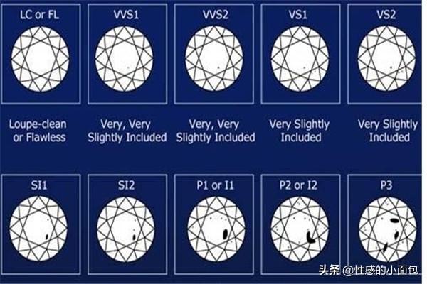 3、 钻石净度si分级的国家标准 根据我国国家标准,钻石的净度共分为LC(无暇级)、VVS(极微瑕级)、VS(瑕疵级)、SI(小瑕级)、P(有瑕级)五个大级别,在此基础上,又根据净度特征的大小、数量、位置和性质细分为LC、VVS1、VVS2、VS1、VS2、SI1、SI2、P1、P2、P3 十个小级别。