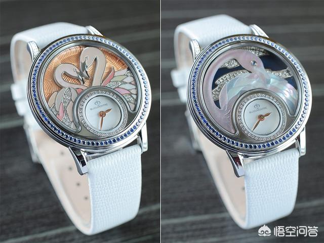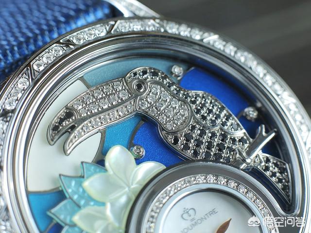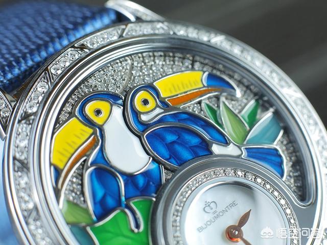 表盘风景均是由数种精湛工艺技术所打造,包括珍珠贝母雕刻、珐琅及钻石镶嵌等。巨嘴鸟的日与夜呈现出两种风格,日间的巨嘴鸟成双成对,以密镶钻石为背景,另以线条勾勒出巨嘴鸟及树叶的轮廓,再以珐琅填上色彩,同时不忘加入一些线条及刻纹作装饰,增加图案的立体感及层次,其色彩更是鲜明,彩蓝的羽毛及黄、橙色大嘴,还有翠绿的树叶相伴,远远就能吸引注意。