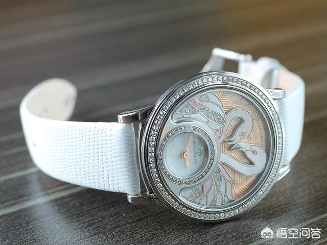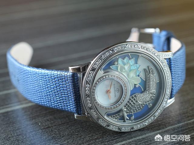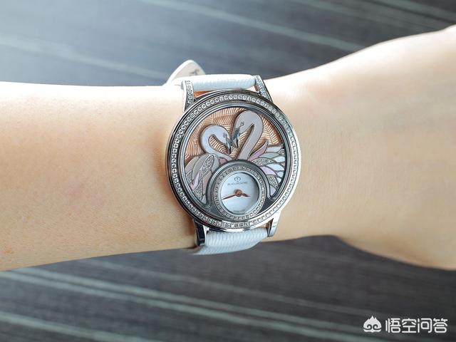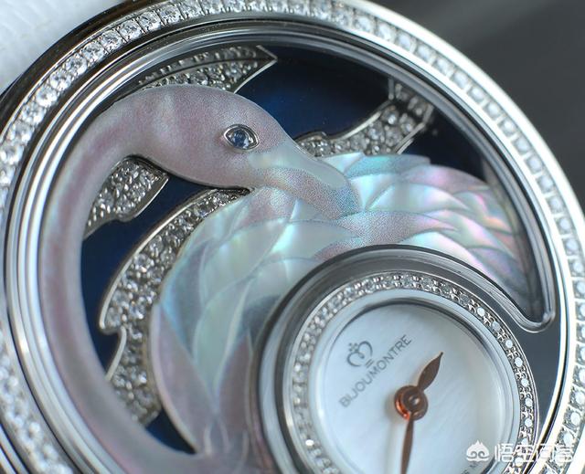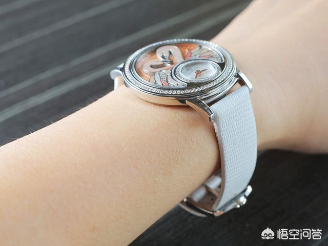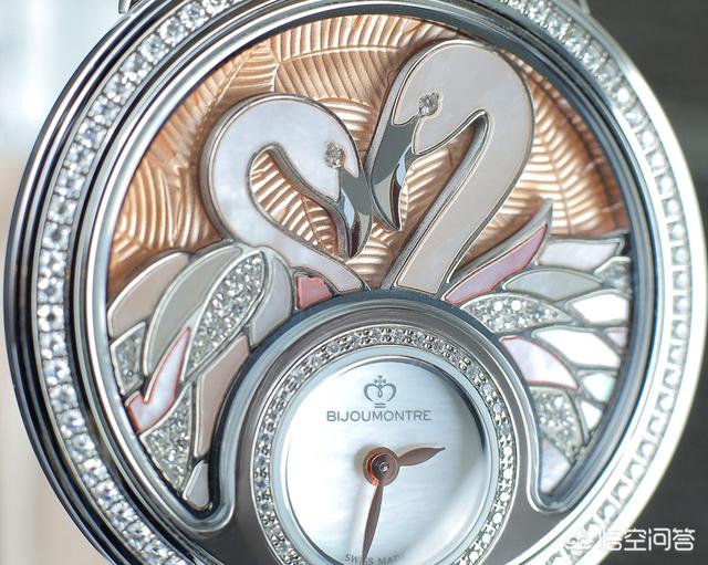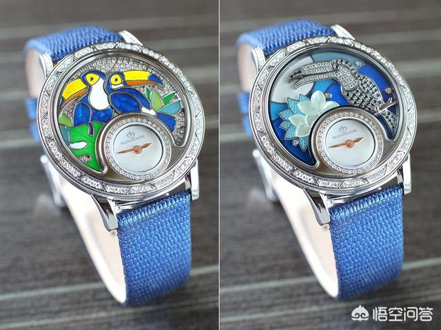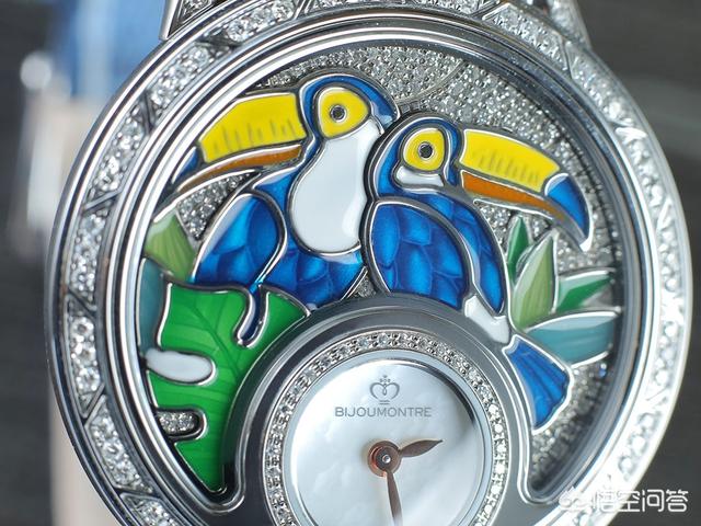 热带丛林腕表的主壳结构并不复杂,设于6 时位的小型表盘被钻石围绕,表盘以珍珠贝母制,衬托柳叶状指针。而表盘上方的新月形框架就是放置小配饰的地方,它就像是一道窗,把热带丛林的珍禽及日夜不同风光呈现眼前。