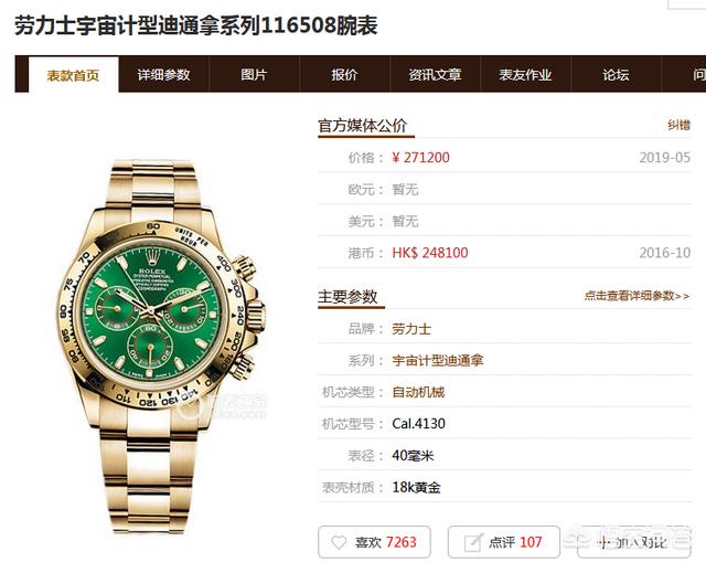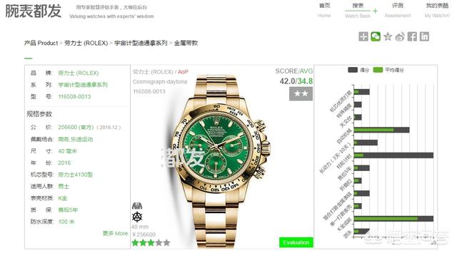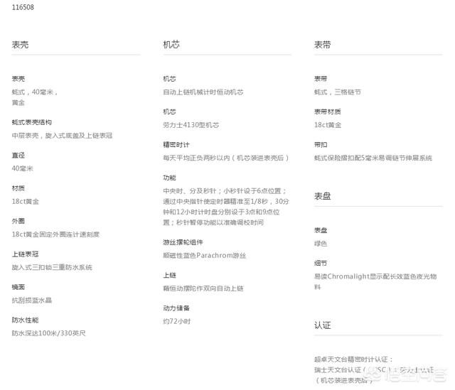 12/11 感谢邀请。 可以看看我们开发的手表测评网站“腕表都发”对这款腕表的评测。 劳力士 (ROLEX) > 宇宙计型迪通拿系列 > 金属带款,型号是 116508-0013 看一下手表的详情页 我简单说一下这些测评数据。 基本参数,40mmK金材质,售价国内价格为256000元人民币,适合佩戴场合为商务和乐适运动场合,不建议作为正装表佩戴。 机芯为自产4130机芯,带有导柱轮的计时表,动力储存超过70小时,防水为百米。 关于这款表,我想说以下几点,方便大家的了解。 1,表链 和劳力士的蚝式日志款类似,这款迪通拿的表带是用的蚝式表带,中间部分是抛光的,两边则采用了拉丝的方式处理,此类复合打磨方式的表链在金属链表款里比较常见,中间链节部分比较容易划伤。 复合打磨方式是增加了一道工序,成本要高出不少,所以此处作为一个加分项。 2,特殊精度 精密时计认证是劳力士对近两年的款式进行的一次升级,保证每天平均正负两秒以内(机芯装进表壳后),远远超过一般的天文台认证(-4~+6/天),此处也作为一个加分项。 综上,这款表最终得分为42分,而此价位段内的平均分是34.8。两颗星星是该表机芯的做工星级,伯尔尼级典型做工,低于洳山谷和日内瓦地区的手工打磨。 更多可以到腕表都发查找。 我们的网站是腕表都发,wanbiao800,小程序可以直接搜索腕表都发,欢迎使用,有体验上的建议和意见请告诉我。 用专家智慧评估手表,大咖在后台Valuing watches with experts' wisdom |