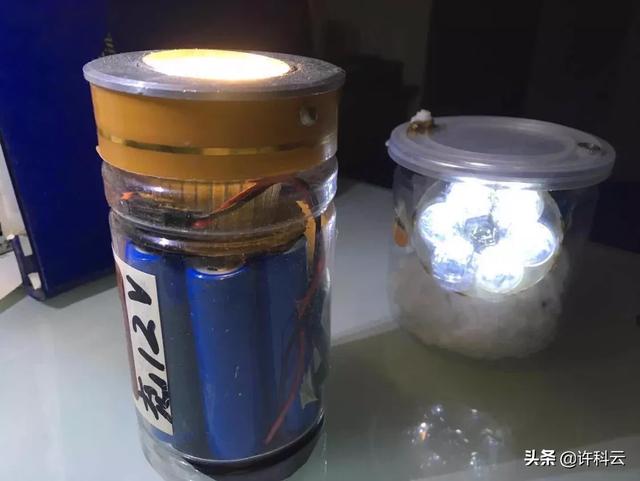 手提灯内装满了手机锂电池,多功能灯,上面可调光整夜照明,大灯是汽车LED聚光灯,后面是散光一个灯珠照明、