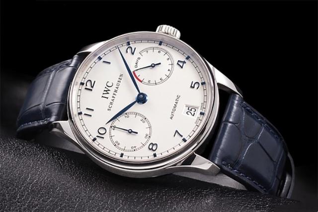 万国最让我印象深刻的就是这只葡萄牙系列七日链,俗称“葡七”。这只表实在是太漂亮了,白色表盘搭配蓝色指针与时标。并且采用对称式布局,看上去非常舒服。蓝宝石水晶镜面经过镀蓝膜处理,表壳直径为42mm,搭载超长动力储备机芯,配蓝色表带。