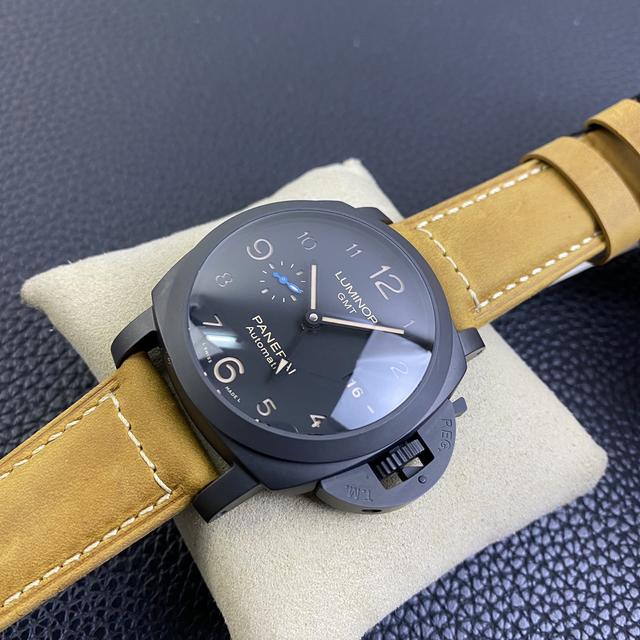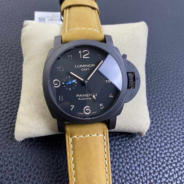 沛纳海最让我印象深刻的就是这只Pam1441,腕表的表壳采用黑色陶瓷打造,直径为44mm,表盘上是经典的两针半布局,9点位是秒针,配置蓝宝石水晶镜面,表壳右侧面是品牌标志性大护桥。搭载全自动上链机芯,配棕色疯马皮表带。