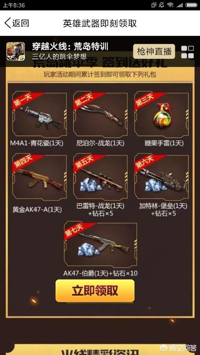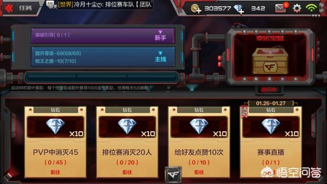 钻石的另一个来源就是精彩活动里的火线每日礼,任务的内容通常是狙击击杀,团队战击杀,爆破击杀,其中团队战的最好做,狙击和爆破的稍微麻烦一点。在完成任务以后也会给你两个箱子,箱子里会开出钻石来,还是很不错的。