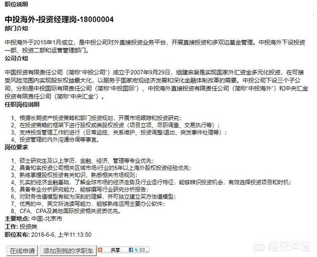 然后,再看招聘的重头戏,中投海外-投资经理岗,这是一个专业岗位。该岗位其实并未明确要求考生必须使从985、211系列高校毕业,也并未明确要求考生必须是从清华、北大、人大等顶尖高校毕业的——其实,国内BAT等巨头企业的一系列核心岗位会直接列出符合条件的大学名单,与之相比,中投下面的职位说明相当平民化,只要岗位要求,应该都能投简历、申请,但是能不能在万千求职者从受到中投HR、人力主管、部门主管等的青睐,这可是一次非凡之旅,不知道有多少求职者挂在面试的路上,只能铩羽而归。