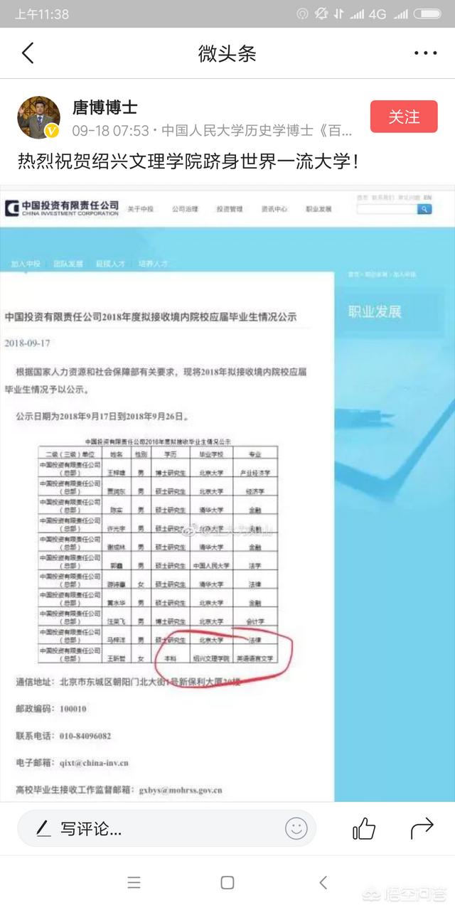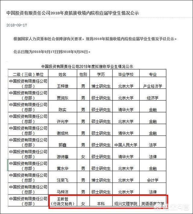 近日,微博上一则有关《中国投资有限责任公司2018年度拟接收境内院校应届毕业生情况公示》截图瞬间火爆了起来,为啥呢?因为绝大部分入围的都是清华、北大的硕博学生,还有一个人大的硕士,只有一个是绍兴文理学院的,一看相当扎眼,就引起了好事者的转载和议论纷纷,甚至有媒体人员质疑存不存在“萝卜招聘”的嫌疑,搞得这样一桩小事情,还上了头条,其中有两则还被刊登在了澎湃上。