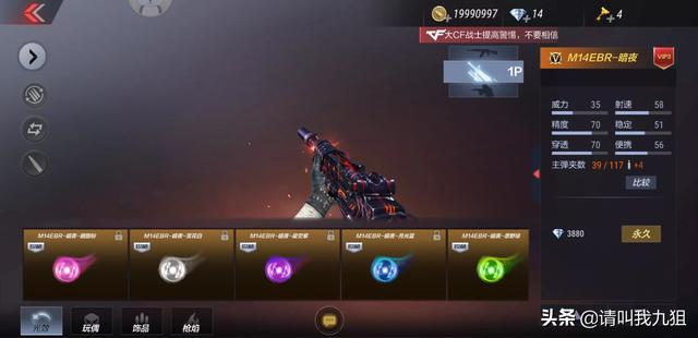 4)M14EBR暗夜,原型是M14半自动步枪,这把枪威力比ak稍弱,比m4强,有防弹头盔也能一枪爆头,作为能觉醒的枪械,觉醒后也是不输于主流英雄级武器。