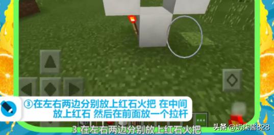 3、在左右两边分别放上红石火把,在中间放上红石,在前面放一个拉杆。