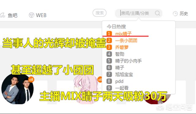 乔碧萝是因为活动PK才露出的真容,而当时的PK另一主播就是Mix晴子。因为乔碧萝直播间被封建的原因,很多吃瓜群众都来到了2号女主角的直播间内看看热闹,目前已经持续三天的时间登顶斗鱼热搜排行榜。这波事件虽然给斗鱼带来了一些负面,但同时带来了数不尽的人气。在直播间当中都可以看到一些是刚刚注册的一个小号,前来观赏一下子就给该平台提供了巨大的流量。斗鱼这波0损耗的打了一波天大的“广告”。
