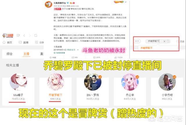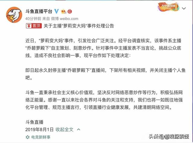 斗鱼在凌晨时分发表公告:“近日萝莉变大妈事件引起了社会的广泛关注,经平台调查,该事件由乔碧萝殿下自主策划、刻意炒作,即日起永久封禁主播乔碧罗殿下的直播间下架她所有的视频,并关闭她的鱼吧,在封禁之后,立马又有一个相同名字的直播间诞生,只不过是一个趁热度的假直播间罢了。