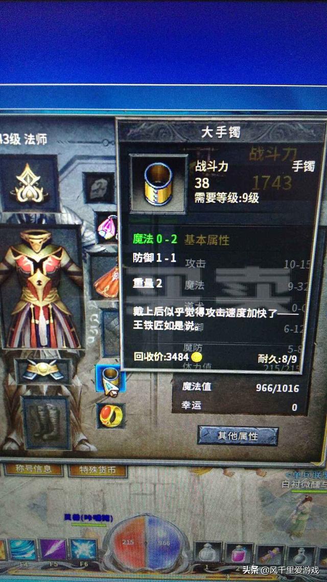 这个号的一身装备全都是极品,任何一个拿出来就抵普通人的大半年工资吧。这个攻六的死神手套也是超级极品,那个道士头也是攻4,记忆链是攻2—5,圣战戒指就是上图的攻10,整套装备没一件普通货。